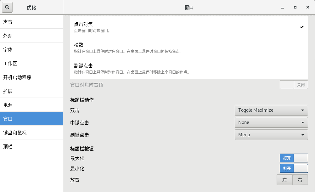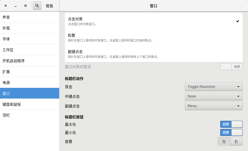 打开之后有很多选项,咱们先找到“窗口”那一节: 在”标题栏按钮“那里就能打开(或者关闭)最大化和最小化按钮啦~