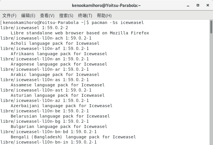可以看到还有一些 iceweasel-l10n 一类的是 Iceweasel 的语言包啦 ,用 pacman -S 可以安装指定的软件包,但是……