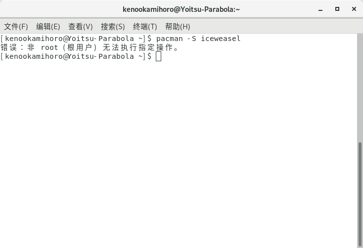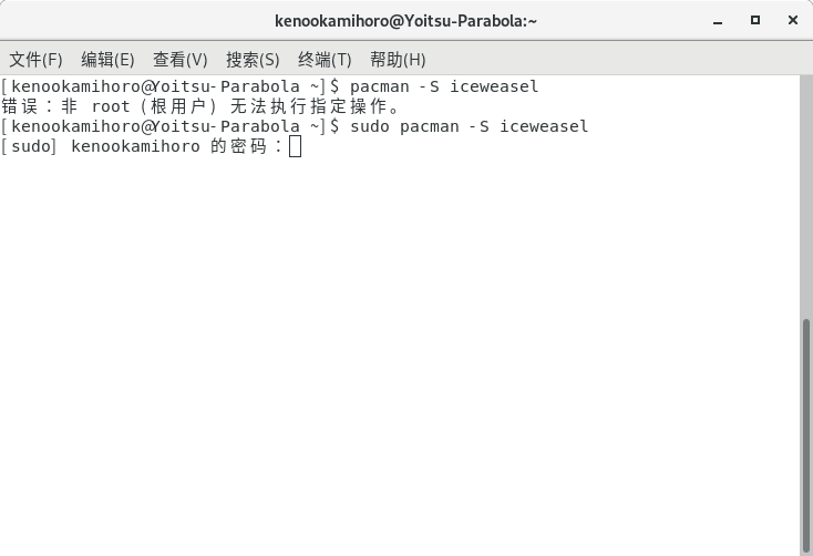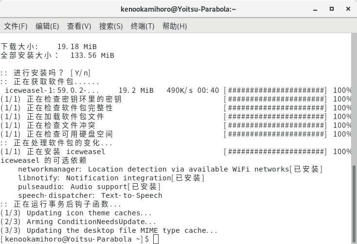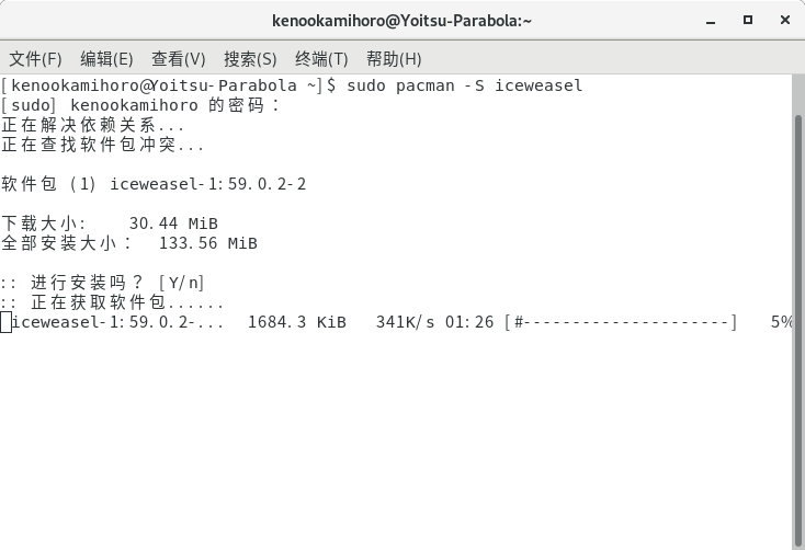 于是就装 Iceweasel 了(就是改了商标的 Firefox),用 pacman -Ss 可以在仓库中搜索软件包。